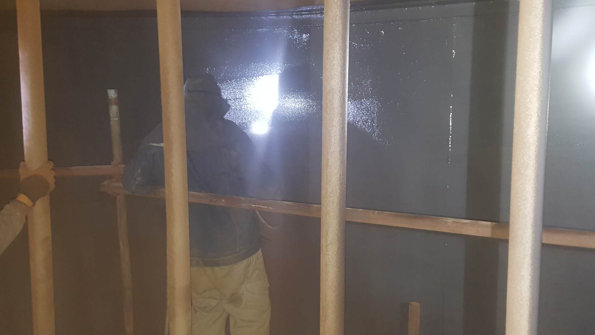 5、內(nèi)襯:將無溶劑脫硫塔防腐材料的A、B組份在攪拌狀態(tài)下分別加熱。用噴涂機(jī)按雙組份7:1的比例將無溶劑脫硫塔防腐材料均勻地噴涂到保持65~70℃表面,其噴涂量應(yīng)使一次噴涂的內(nèi)襯層在固化后達(dá)到合同規(guī)定的厚度。在20℃以上至少保持24h,使內(nèi)襯充分固化。